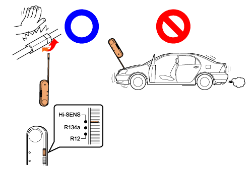 | Place the gas leak tester probe adjacent to a pipe connection, part, A/C unit, drain hose or A/C blower vent. |