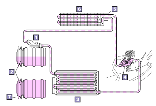 | During A/C compressor operation, A/C compressor oil circulates in the A/C system. After the A/C compressor stops, some oil remains throughout the A/C system. |