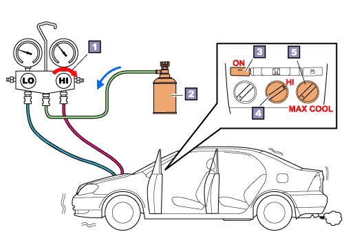 IAfter checking that the high-pressure side valve is closed, start the engine and operate the air conditioner.