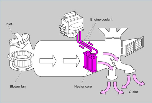 | To heat the air introduced into the cabin, a heater core is used as a heat exchanger. The heater core allows the engine coolant, heated by the engine, to flow through the core and uses the heat to heat the air drawn in by the blower fan. However, as the temperature of the heater core is low until the engine coolant reaches full operational temperature, the heater core doesn't function well as a heater immediately after the engine starts. |