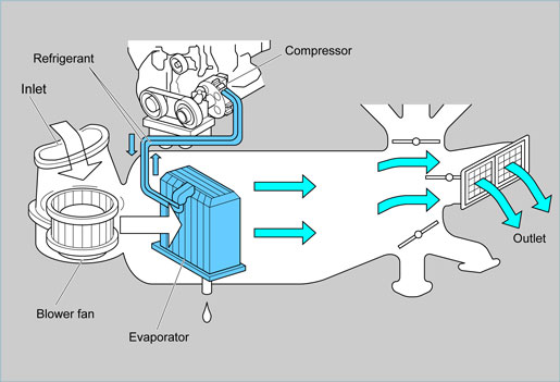 To cool the air introduced into the cabin, an evaporator is used as a heat exchanger. When the air conditioner switch is turned on, the compressor begins to operate and circulates the refrigerant through the evaporator.