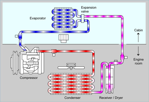 This cold liquid/gaseous refrigerant flows to the evaporator. Vaporizing the liquid in the evaporator, the heat from the warm air stream passing through the evaporator core is transferred to the refrigerant. All the liquid changes into the gaseous refrigerant in the evaporator and only heat-laden gaseous refrigerant goes into the compressor.