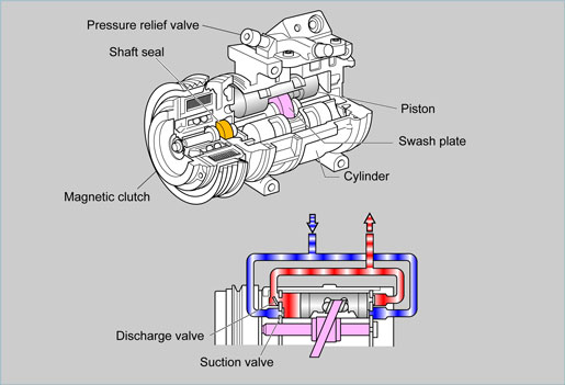 A number of paired pistons are set on the swash plate at intervals of 72° for a 10-cylinder compressor or at intervals of 120° for a 6-cyiinder compressor.