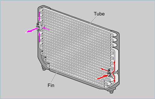| The high-temperature, high-pressure gaseous refrigerant sent from the compressor separates out into the 3 internal passages, or tubes, at the entry port of the condenser before passing through the condenser to be cooled. |