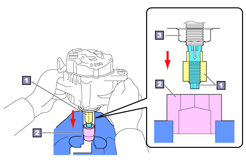 Hold the SST2 in a vise and then with SST1-A and SST1-B installed on the alternator, insert the pulley lock nut into the hexagonal part of SST.