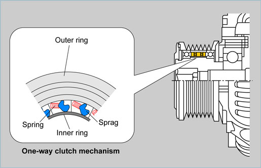 Some engines use a pulley that has a one-way clutch function. The one-way clutch incorporates a number of sprags and springs arranged around the pulley circumference between the outer ring and inner ring, enabling the one-way clutch function to be achieved. This function can absorb the small changes that occur in the engine speed while transmitting power only in the direction of engine rotation. As a result, the load applied to the V-ribbed belt is reduced |