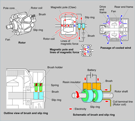 The rotor is a rotating magnet positioned inside the stator coils that produces the magnetic field to generate an electromotive force in the stator coils. The rotor coil is wound around six pairs (12 poles) of pole cores (magnetic pole) and these become an electromagnet when current flows in the coil.