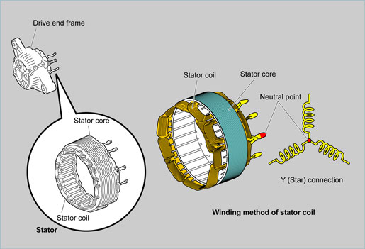 The stator generates three-phase alternating current by the changing magnetic flux caused by the rotor turning. The stator consists of the stator core and the stator coils and is built into the drive end frame as a unit