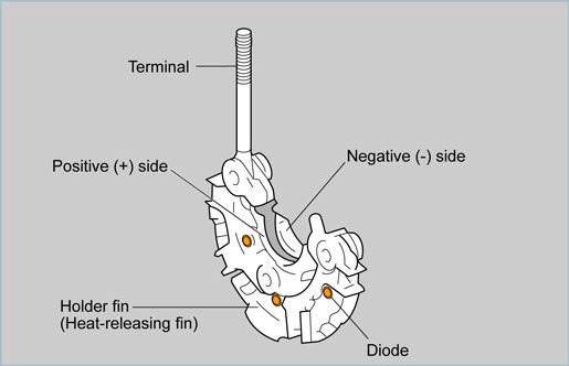 The diodes used for rectification produce heat as the current passes through them. However, because the elements of the diode itself (semi-conductor material) are sensitive to heat, excessive heat build-up will cause poor rectification and possible diode failure. Therefore, the holder fin (heat-sink) is required to provide a large surface area to absorb and release this heat. |