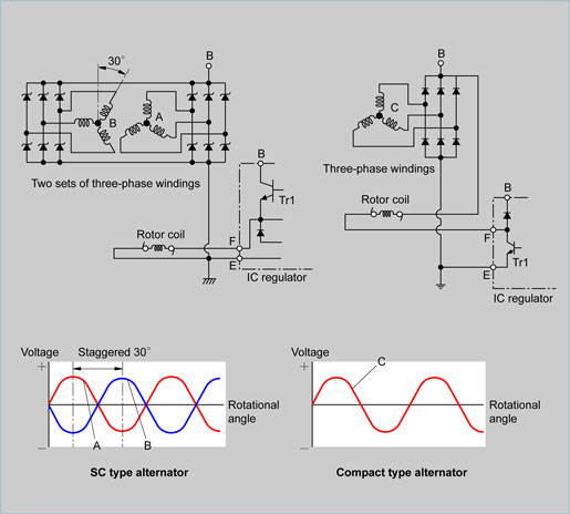 | This system consists of two sets of three-phase windings whose phases are staggered 30°. Because the generated waves from the respective windings cancel out each other, magnetic noise is reduced. |