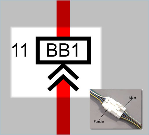 The alphanumeric characters in the rectangle (BB1) show the connector code, and the number outside the rectangle (11) shows the pin number.