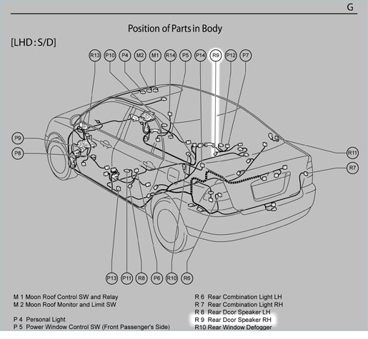 This shows us where the part corresponding to the connector code R9 REAR DOOR SPEAKER RH is located on the vehicle. Therefore, the parts location can be simply found by looking as follows.