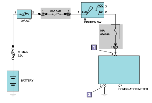 Turning the ignition switch to the ON position will apply battery voltage to the combination meter via the ignition switch. As a resullt the combination meter is activated.