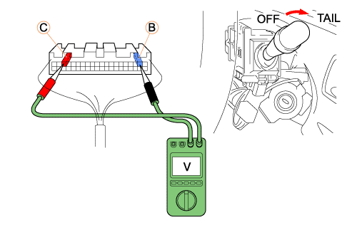 When turning the light control switch to the TAIL position, measure the voltage change between combination meter connector terminal C and terminal B.