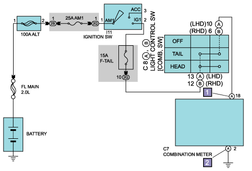 Turning the light control switch to the TAIL position will apply battery voltage to the combination meter (terminal C) via the light control switch. As a result the combination meter is illuminated.