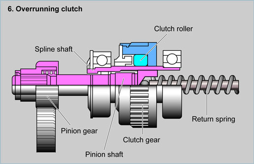 In order to prevent damage to the starter by excessive speed, such as when the engine starts, the overrunning clutch incorporates a one-way type mechanism using rollers. |
