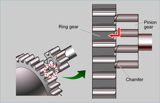 The pinion gear and the ring gear are chamfered for easy engagement.
