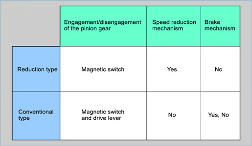 | The construction of the magnetic switch of a conventional type starter is basically the same as that of the reduction type starter. However, the conventional type pulls the plunger to engage and disengage the pinion gear, whereas the reduction type pushes the plunger. |