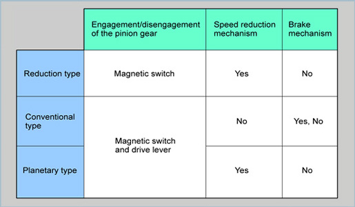 The magnetic switch and the drive lever operate in a similar way as the conventional type starter.