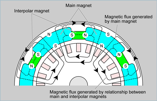 The main and interpolar magnets are arranged alternately inside the yoke. This allows the magnetic flux generated between the main and interpolar magnets to be added to the magnetic flux generated by the main magnets. In addition to increasing the amount of magnetic flux, this construction shortens the overall length of the yoke. |