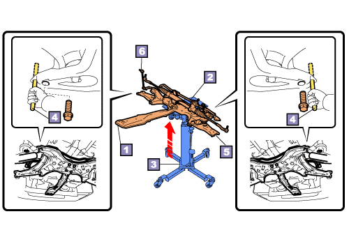 Secure the suspension cross member and centre member to the transmission jack using some pieces of string so that the suspension cross member and centre member do not drop.