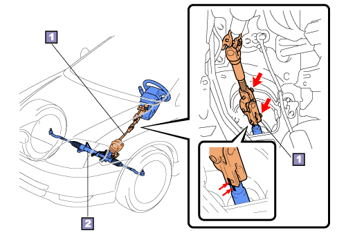 Make sure the steering wheel and steering gear are in the centre position. Then align the steering intermediate shaft and steering gear matchmarks and connect the two. Tighten the bolts to fasten them in position.