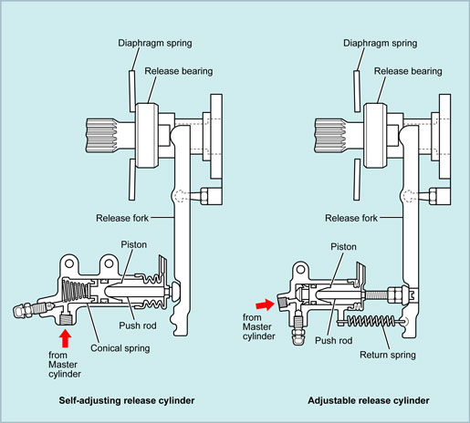 The clutch release cylinder moves the piston with hydraulic pressure from the master cylinder and operates the release fork through the push rod.