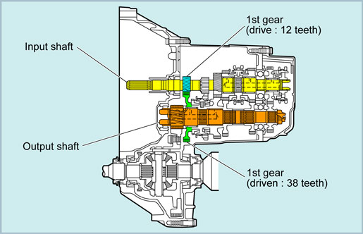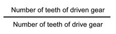 If the driven gear has 38 teeth and the drive gear has 12 teeth, for example, the reduction ratio of this 1st gear is 38/12 = 3.166.