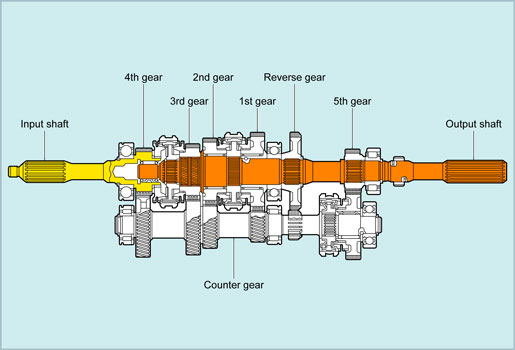 For manual transmissions, the input shaft and the output shaft are located on the same axis and the counter gear integrates the input shaft and the output shaft to transmit power.