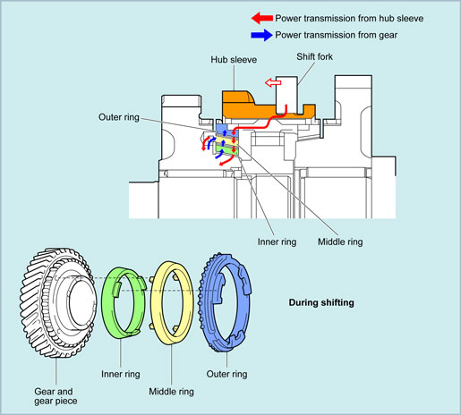 To increase the synchromesh capacity, recent models have adopted a triple-cone or double-cone synchromesh mechanism particularly for the 2nd and 3rd gears.