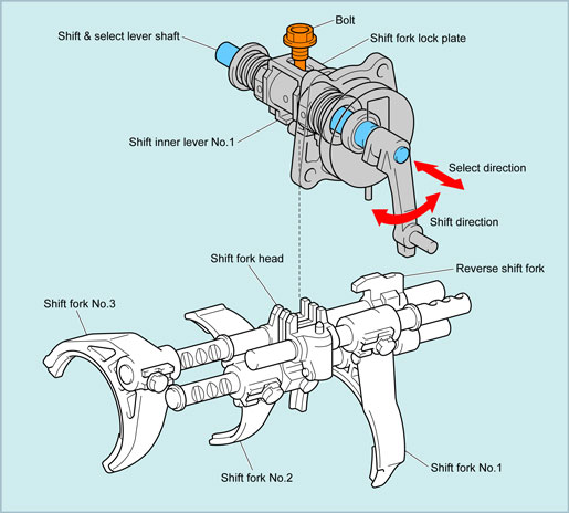 The shift fork lock plate is prevented turning by a bolt which allows the shift and select lever shaft to slide only in the select direction. |