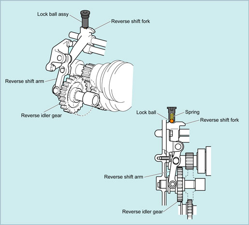 | There is also a groove on the upper surface of the reverse shift fork into which the lock ball is pushed by a spring. When the transaxle is not shifted into reverse, this groove prevents the reverse idler gear from moving. Also, when the transaxle is shifted into reverse, it informs the driver whether or not the gears have fully engaged. |