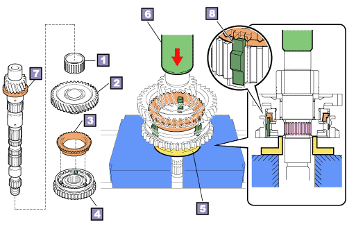 Rotate the gears to align the shifting key with the groove on the synchronizer ring.