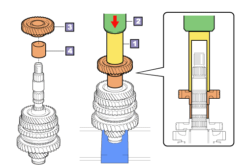 Set and attach SST. Then use the hydraulic press to press in the clutch hub, gears and bearing.