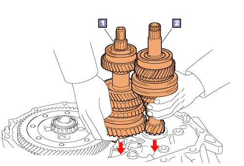 To install the input and output shafts, first engage the gears. Then align them with the differential ring gear and put the shaft straight on.