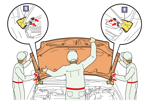 two people support the hood on the left and right sides while loosening the bolts.