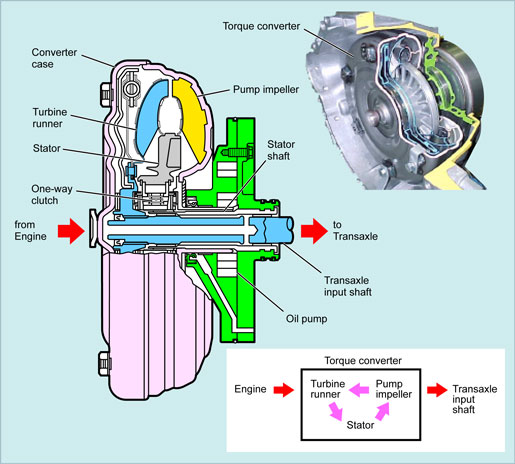 The torque converter both transmits and multiplies the torque from the engine using the ATF (Automatic Transaxle Fluid) in the transaxle as the medium.