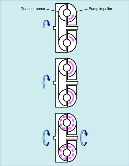 Transmission of torque is effected by the fluid circulation through the pump impeller and turbine runner.