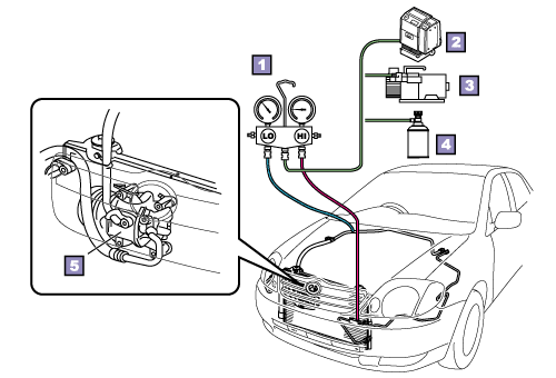 | If the Air Conditioning (A/C) cooling performance is insufficient, first check the amount of refrigerant is within specifiction. If the amount of refiigerant is insufficient, check for gas leaks and repair the defective parts before re-charging the A/C system. |