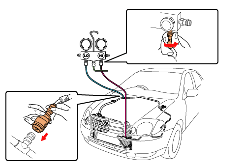 During insection do not connect to the centre (green) manifold gauge charging outlet.