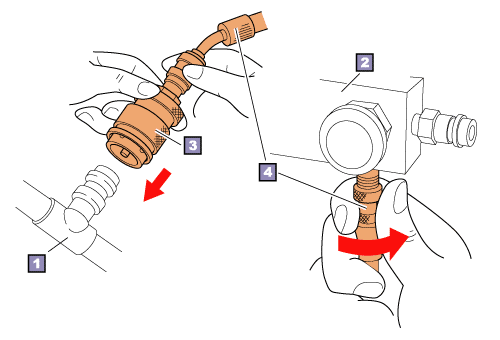 When connecting the hose to the service valve on the vehicle firmly press the quick joint against the service valve. Correct connection is confirmed with a clicking sound.