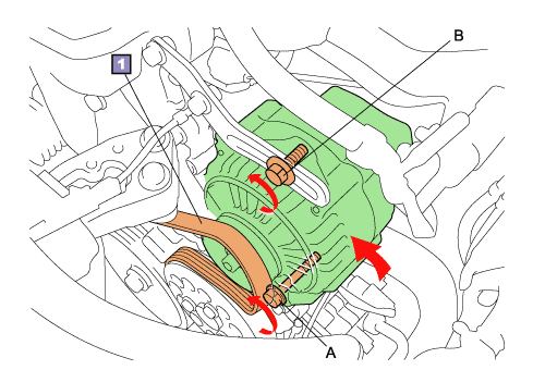 Loosen the mounting bolts (A) and (B) of the alternator that are used to adjust the drive belt tension.