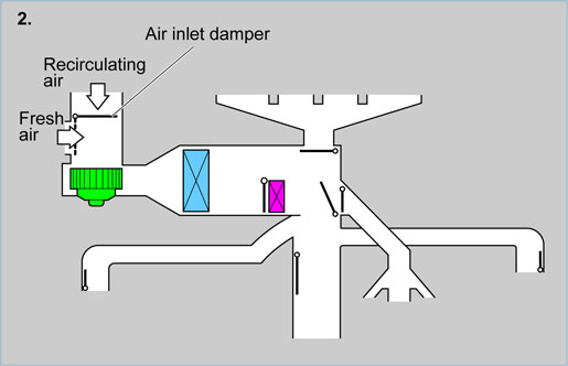 The air inlet selector switches the air inlet control between either recirculation or fresh modes. In ordinary usage the fresh (outside) air intake should be selected. When the fresh (outside) air mode is selected, the air inlet damper opens the fresh (outside) air suction port and closes the recirculation (inside) air port. If the outside air is polluted, the air inlet selector should be switched to the recirculation mode.
