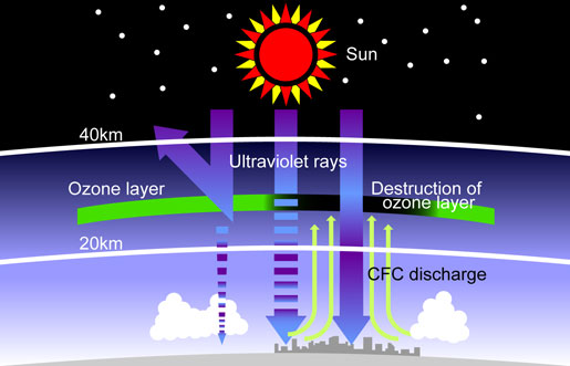 Refrigerant type CFC-12 (R12) had been used for automotive A/C systems up until 1995. However, CFC-12 (R12) was found to destroy the ozone layer when it is released into the atmosphere. The depletion of the ozone layer increases the amount of ultraviolet rays from the sun that reach the earth, increasing the incidents of diseases such as skin cancer as well as causing environment destruction, and this has become a global problem.