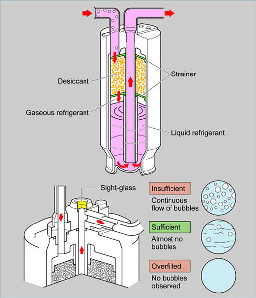 Generally, if lots of continuous bubbles are seen in the sight-glass, the amount of refrigerant is insufficient. Alternatively, if a few, occasional bubbles are seen, the amount of refrigerant can be judged as appropriate.