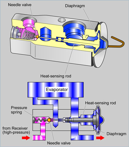 After leaving the receiver dryer, the expansion valve injects the high-temperature, high-pressure liquid refrigerant from the small hole at the needle valve causing the refrigerant to suddenly expand and to change into a low-temperature, low-pressure mist refrigerant. |