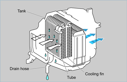 As the air that has passed the evaporator cools, the moisture in the air condenses and forms water droplets on the cooling fins. These moisture droplets fall into the drain pan and are drained away from the vehicle through the drain hose. |