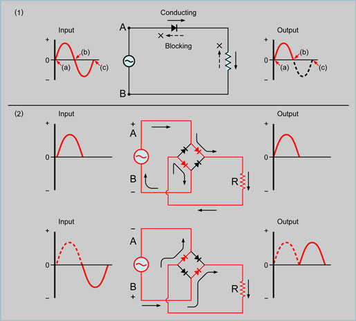 However, because the voltage shown between (b) and (c) is applied to the diode in the reverse direction, the current is not allowed to pass through the diode.