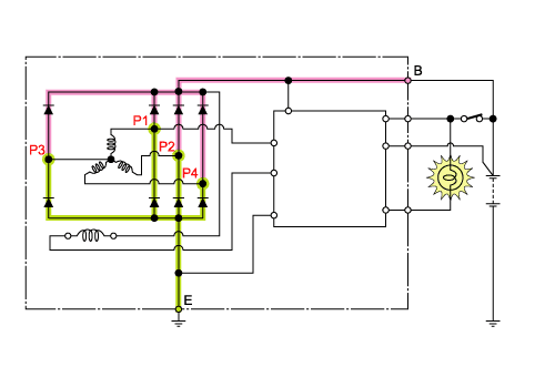 Measure between the terminal B of the rectifier and terminals P1 to P4, then reversing the polarity of the tester lead, and check that there is continuity in one direction only.