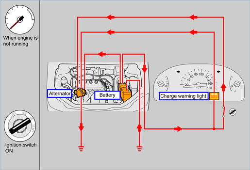 When the ignition switch is in the ON position, current flows from the battery to the alternator. The reason for this is to prepare the alternator to supply electricity before starting the engine. Most alternators used in modern vehicles generate electricity by rotating a magnet, called a rotor. This magnet (rotor) is not a permanent magnet, but an electromagnet, that generates a magnetic force when electricity flows through it. Therefore, it is necessary to allow some electricity to flow through the alternator before it starts to rotate to assist in generating electricity once it commences rotation. |